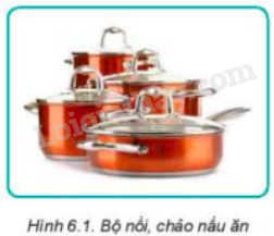 Em hãy quan sát Hình 6.1 và cho biết Bộ nồi, chảo nấu ăn thường được làm bằng những vật liệu gì? Tại sao lại sử dụng vật liệu đó?