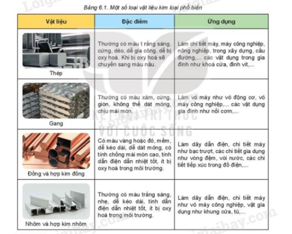 Từ bảng 6.1 và dựa vào hiểu biết thực tế để xác định các vật liệu kim loại làm ra các sản phẩm trên.