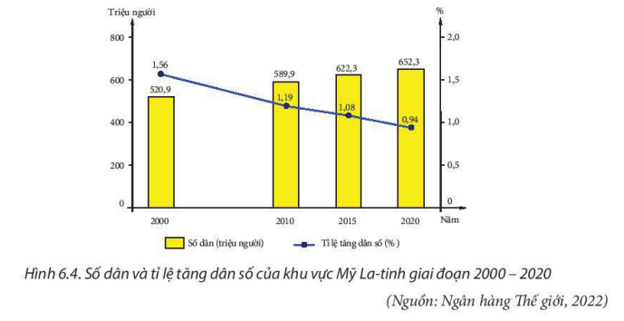 Dựa vào hình 6.4 nhận xét sự thay đổi số dân và tỉ lệ tăng dân số của khu vực Mỹ La-tinh giai đoạn 2000 – 2020