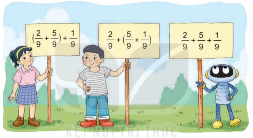 Vậy \(\left( {\frac{2}{9} + \frac{5}{9}} \right) + \frac{1}{9} = \frac{2}{9} + \left( {\frac{5}{9} + \frac{1}{9}} \right) = \frac{2}{9} + \frac{5}{9} + \frac{1}{9}\)