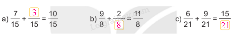 – Dựa vào cách cộnghai phân số cùng mẫu số để tìm số còn thiếu ở ô trống