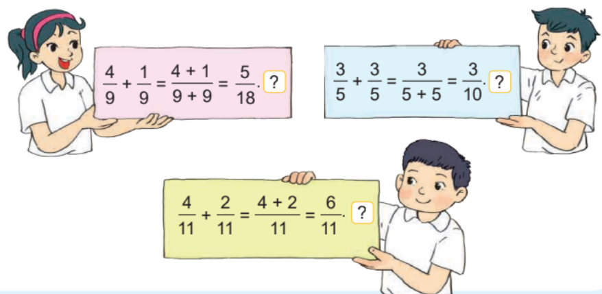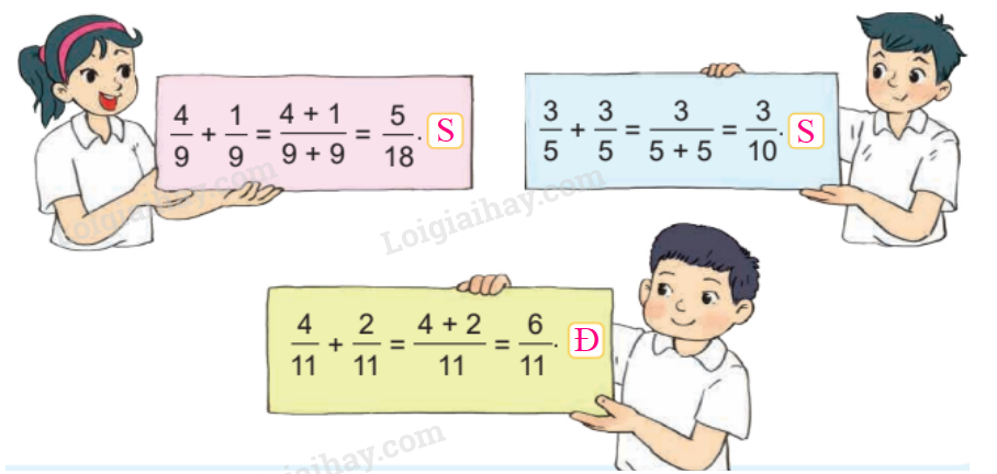 Dựa vào cách cộng hai phân số cùng mẫu số để kiểm tra các câu đúng, câu sai.