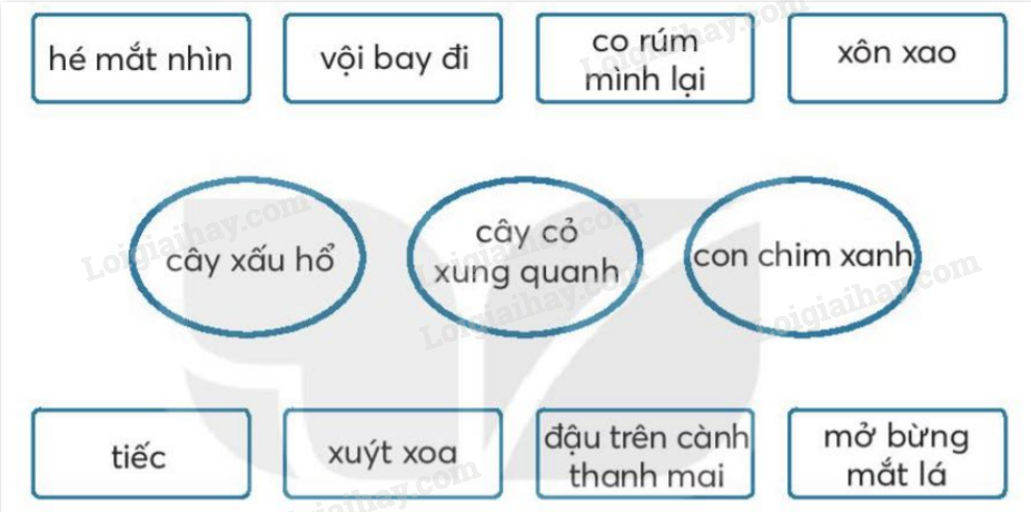 – Từ ngữ chỉ sự vật: cành thanh mai, cây xấu hổ, con chim xanh, cây cỏ, gió