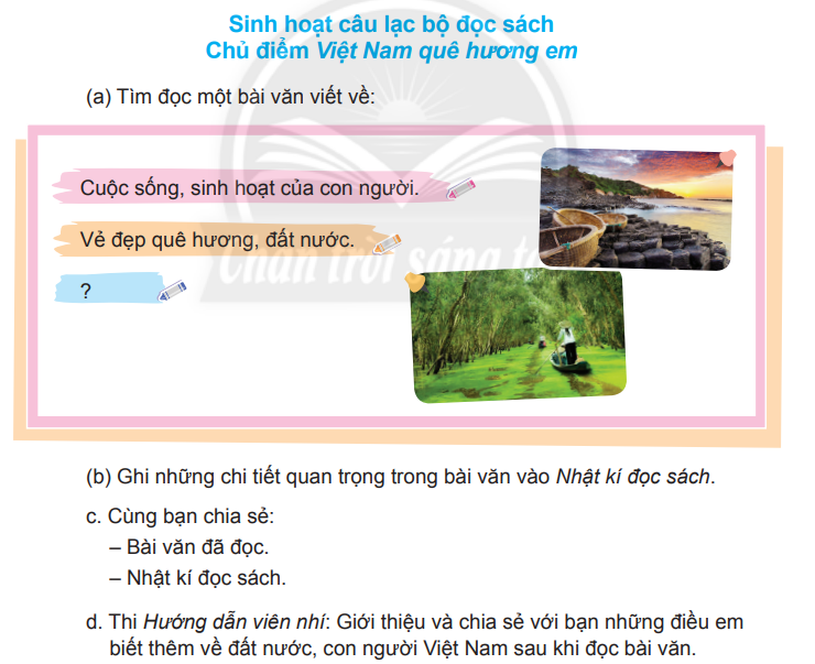 Chia sẻ cùng bạn những hoạt động thường được tổ chức vào dịp tết Nguyên đán ở trường hoặc nơi em sống. Chợ Tết. Vẻ đẹp thiên nhiên trên đường ra chợ Tết được tả bằng những từ ngữ, hình ảnh nào. Dáng vẻ của người, vật trên đường ra chợ Tết có gì đáng chú ý. Em thích hình ảnh so sánh hoặc nhân hóa nào trong bài thơ. Nêu cảm nhận của em về bức tranh chợ Tết được tả trong bài thơ. Đọc mở rộng.