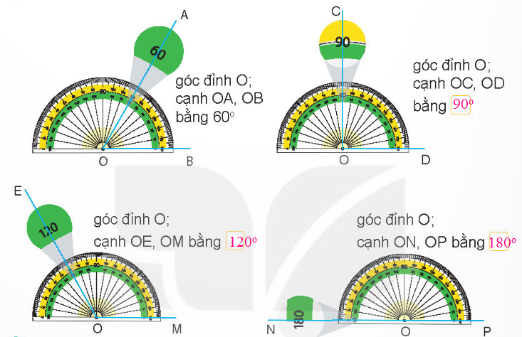 Quan sát thước đo góc rồi nêu số đo của mỗi góc (theo mẫu).