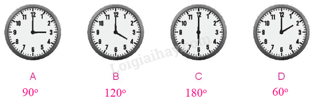 Dùng thước đo góc để đo các góc được tạo bởi hai kim đồng hồ khi đồng hồ chỉ 3 giờ, 4 giờ, 6 giờ, 2 giờ.