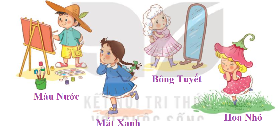 Đoán xem các nhân vật trong tranh có tên thân mật là gì. Tìm câu văn nêu nhận xét về hai bức chân dung của Bông Tuyết và Mắt Xanh. Cách vẽ chân dung Hoa Nhỏ có gì khác với cách vẽ chân dung Bông Tuyết và Mắt Xanh. Đóng vai Màu Nước, thuyết phục các cô bé đồng ý để cậu vẽ chân dung giống người thật. Điều gì khiến các cô bé nhận ra Màu Nước nói đúng. Tóm tắt mỗi sự việc trong câu chuyện Những bức chân dung bằng 1, 3 câu.