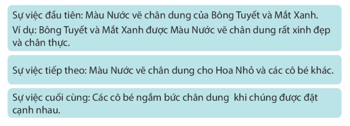 – Sự việc tiếp theo: Màu Nước vẽ chân dung cho Hoa Nhỏ và các cô bé khác đều có cặp mắt rất to, lông  mi rất dài và cái miệng rất nhỏ.