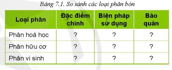 Hãy so sánh các loại phân bón theo bảng 7.1