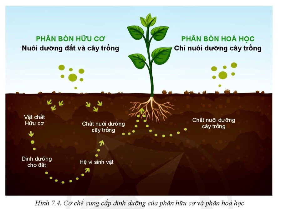 2. Quan sát hình 7.4 cho biết sự khác nhau về cơ chế cung cấp dinh dưỡng của phân hóa học và phân hữu cơ.