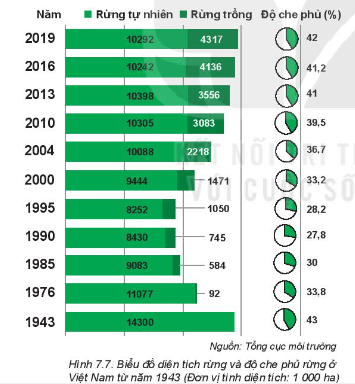 Quan sát biểu đồ Hình 7.7 và nhận xét về diện tích, độ che phủ rừng ở Việt Nam qua các năm và tác động của những chính sách của chính phủ trong việc bảo vệ rừng