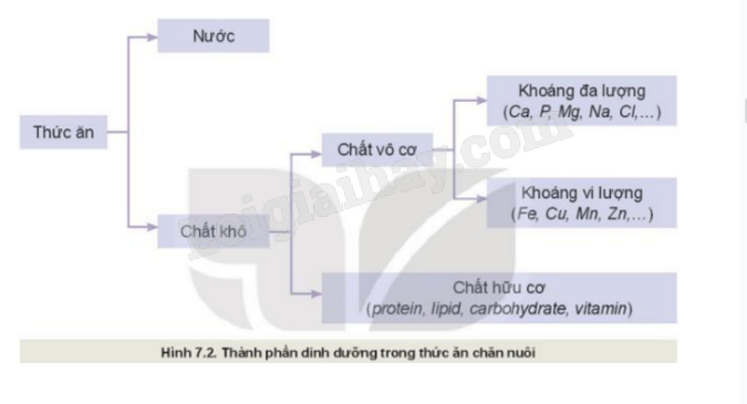 Quan sát Hình 7.2 và nêu các thành phần dinh dưỡng trong thức ăn chăn nuôi.