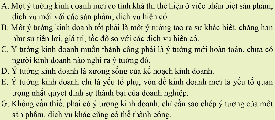– Ý kiến C, không đồng tình. Vì ý tưởng kinh doanh là những suy nghĩ, hành động sáng tạo, có tính khả thi, có thể đem lại lợi nhuận trong kinh doanh. Và trong kinh doanh, ý tưởng kinh doanh không nhất thiết phải là ý tưởng mới hoàn toàn; mà chúng ta có thể cải tiến trên cơ sở ý tưởng kinh doanh đã có trước đó.