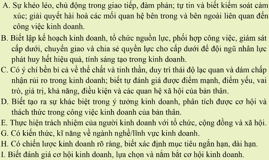 Đọc các biểu hiện và nêu được năng lực của người kinh doanh được thể hiện trong các biểu hiện đó.