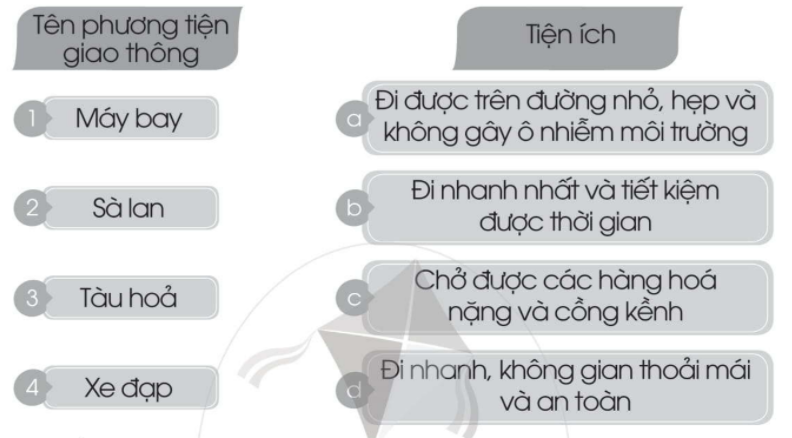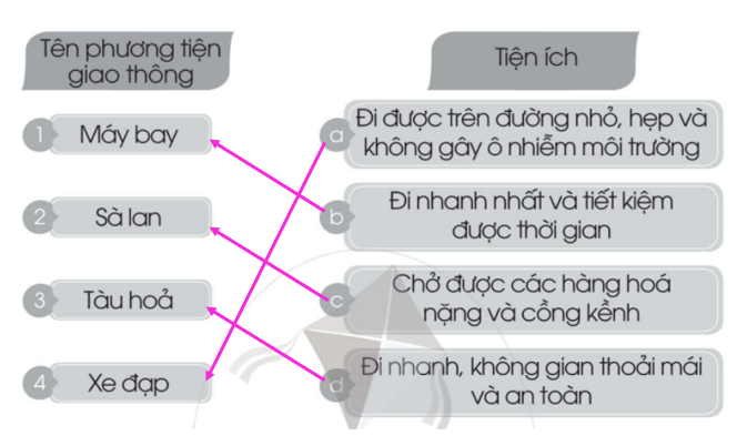 Nối tên phương tiện giao thông với tiện ích cho phù hợp.
