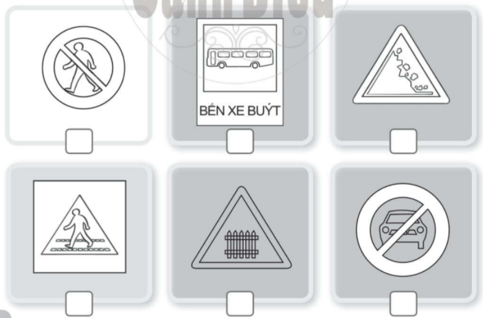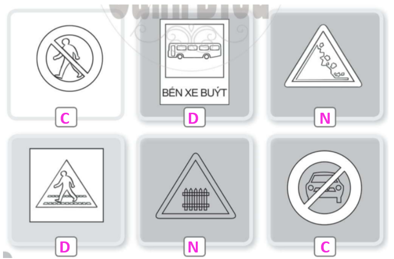 b. Viết vào ô □ chữ D dưới biển báo chỉ dẫn, chữ C dưới biển báo cấm; chữ N dưới biển báo nguy hiểm.