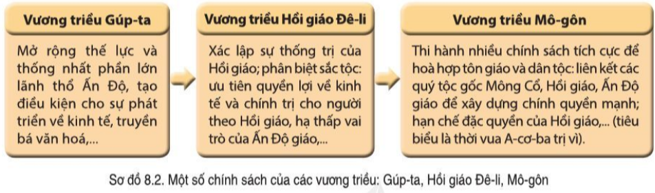Đọc thông tin và quan sát lược đồ 8.2, hình 8.3 hãy trình bày khái quát tình hình chính trị của Ấn Độ dưới thời vương triều: Gúp-ta, Hồi giáo Đê li, Mô-gôn.