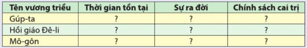 B1: Dựa vào nội dung SGK về các vương triều như Gúp -ta, Đê-li, Mô-gôn