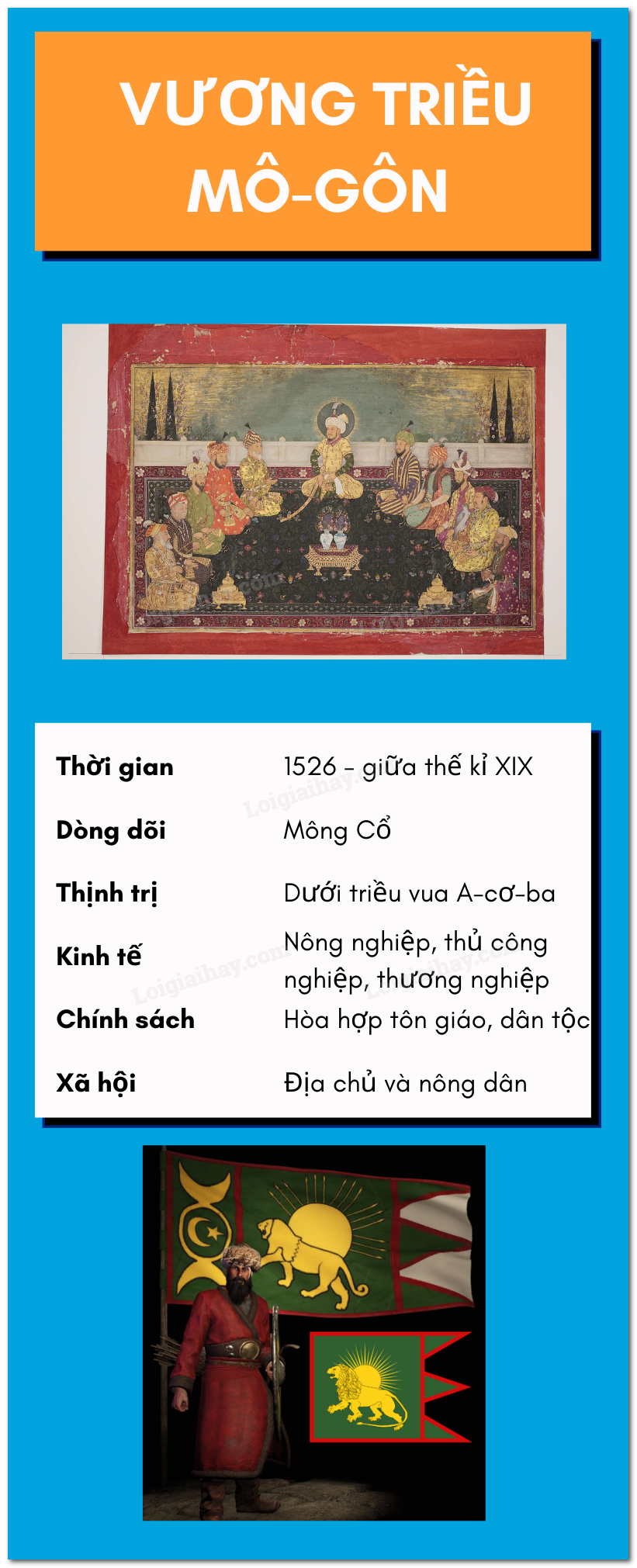 – Vương triều Mô-gôn ra đời năm 1526, gắn liền với cuộc xâm lược của một bộ phận người Mông Cổ (theo Hồi giáo). Sau khi đánh chiếm Đê-li, họ lập ra Vương triều Mô-gôn. Giữa thế kỉ XIX, đế quốc Anh xâm lược và lật đổ vương triều Mô-gôn.