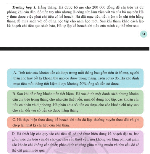 d. Bạn Bình lập kế hoạch chi tiêu hằng tháng. Sau một thời gian, Bình nhận thấy chỉ lớn hơn thu và đã xem lại phần chi tiêu của các tháng trước. Nhận ra một số khoản chỉ chưa hợp lí nên Bình cắt giảm ngay.