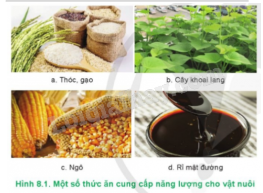 Các loại thức ăn cung cấp năng lượng trong hình 8.1 được sử dụng cho loại vật nuôi nào?