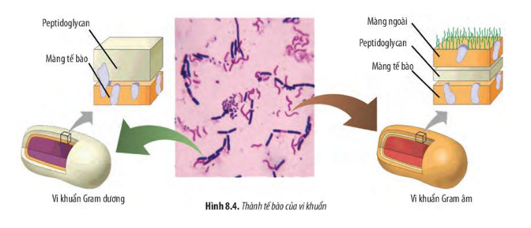 4. Quan sát Hình 8.4, hãy cho biết sự khác nhau giữa thành tế bào của vi khuẩn Gram âm và Gram dương.