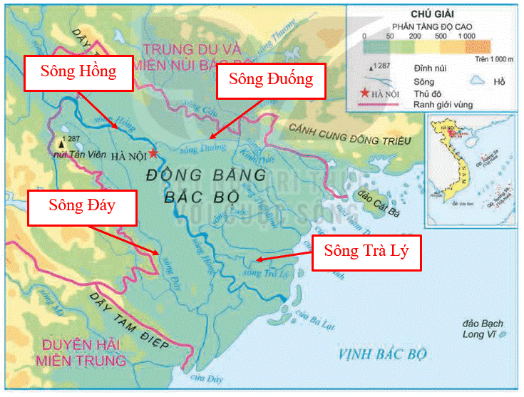 c. Đọc thông tin và quan sát hình 2, em hãy kể tên và xác định trên lược đồ một số sông lớn ở vùng Đồng bằng Bắc Bộ.