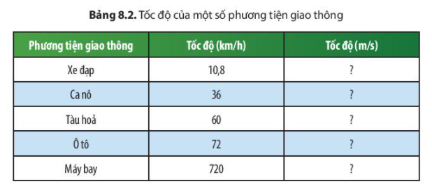 Đổi tốc độ của các phương tiện giao thông trong Bảng 8.2 ra đơn vị m/s.