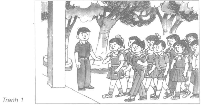 – Tranh 1: Các bạn xếp hàng ngay ngắn và trật tự bước vào lớp.
