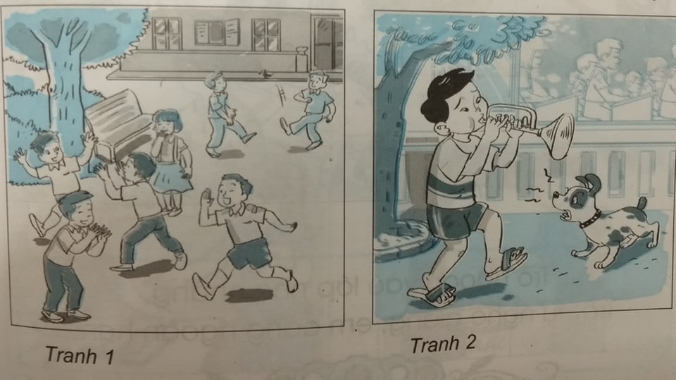 – Tranh 2: Bạn nam thổi kèn ồn ào ảnh hưởng tới lớp học ngay bên cạnh.