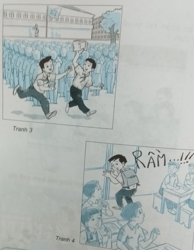 – Tranh 3: Trong khi toàn trường đang xếp hàng nghiêm túc chào cờ thì hai bạn nam lại chạy nhảy đùa nghịch nhau, hai bạn không nên làm như thế.
