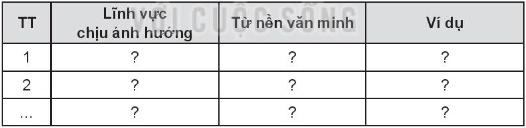 6.1. Lập và hoàn thành bảng (theo gợi ý dưới đây) về những ảnh hưởng của văn minh Ấn Độ, văn minh Trung Hoa đối với Đông Nam Á.