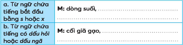 a. Từ ngữ chứa tiếng bắt đầu bằng s hoặc x: dòng suối, xe máy, cây xanh, cái xẻng, con sóc, nhà sàn, xô nước,…