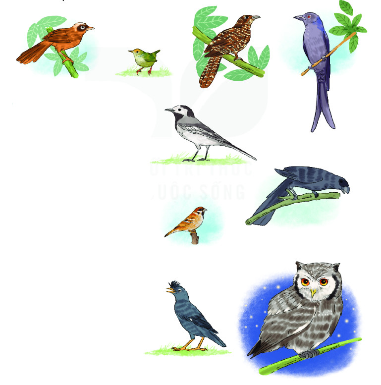 Những loài chim được nhắc đến trong bài vè là: gà, chim sáo, liếu điếu, chìa vôi, chèo bẻo, chim khách, chim sẻ, chim sâu, tu hú, cú mèo.