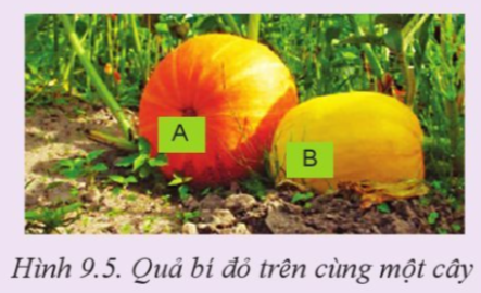 Quan sát Hình 9.5 và giải thích vì sao lại có sự khác nhau về màu sắc của hai quả bí đỏ A và B trên cùng một cây.