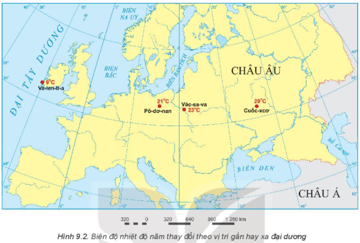 Các địa điểm nằm trên khoảng vĩ tuyến 52oB: Biên độ nhiệt năm giảm dần từ Cuốc-xcơ (29oC) – nằm sâu trong nội địa đến Vác-sa-va (23oC), Pô-dơ-man (21oC) – gần biển Ban-tích và thấp nhất là Va-len-ti-a (9oC) – nằm ven Đại Tây Dương.