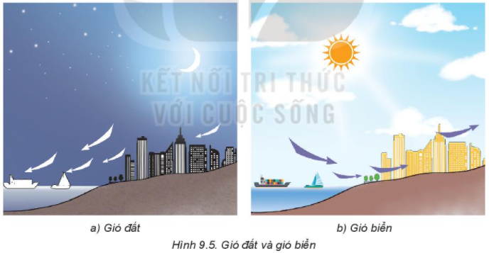– Quan sát hình 9.4 (chú ý mũi tên thể hiện các loại gió chính trên Trái Đất, trình bày theo các tiêu chí thổi từ đâu tới đâu, hướng và tính chất của gió), hình 9.5 (chú ý hướng gió đất và gió biển thổi như thế nào vào ban ngày và ban đêm) và hình 9.6.