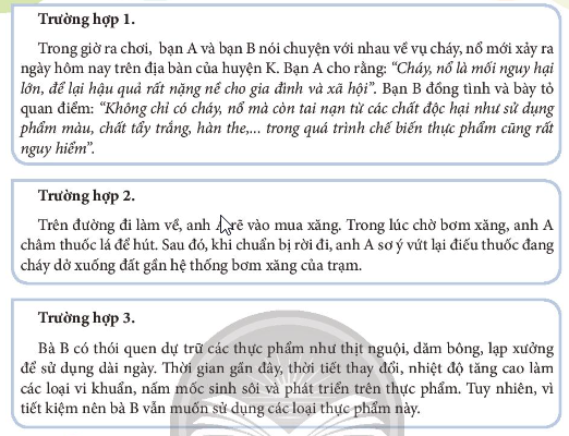 Trường hợp. Trước khi đi công tác, bố mẹ gọi bạn N và em T vào dặn dò: “Bố mẹ đi công tác một tuần, anh em con ở nhà nhớ tự chăm sóc lẫn nhau. Quan trọng là phải bảo đảm không được để xảy ra cháy, nổ và ngộ độc thực phẩm nhé! Thực hiện lời dặn của bố mẹ, bạn N khoá bình ga sau khi nấu ăn xong, tắt điện trước khi ra khỏi nhà. Đặc biệt, bạn N còn dặn em trai khi nấu ăn phải sử dụng các loại thực phẩm sạch, có nguồn gốc rõ ràng.