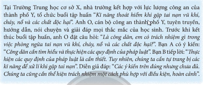 – Ý kiến của các bạn A và B trong trường hợp trên là đúng. Vì: phòng chống tai nạn vũ khí, cháy nổ và chất độc hại là trách nhiệm và nghĩa vụ của mọi công dân; để bảo vệ bản thân mình tốt hơn, mỗi công dân nên tự trang bị thêm cho mình những kiến thức và kĩ năng đúng đắn, khoa học để phòng ngừa hoặc ứng phó khi xảy ra các tai nạn cháy nổ, vũ khí, ngộ độc thực phẩm.