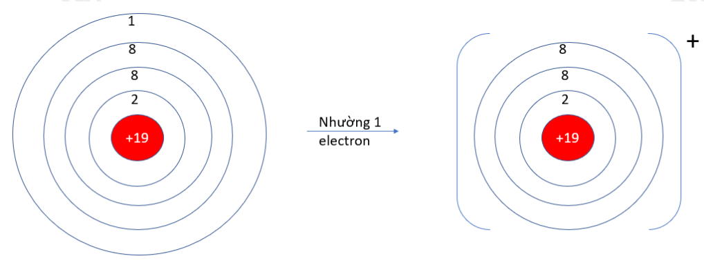 – Cấu hình electron K (Z = 19): 1s22s22p63s23p64s1 => Có 1 electron ở lớp ngoài cùng => Xu hướng nhường đi 1 electron