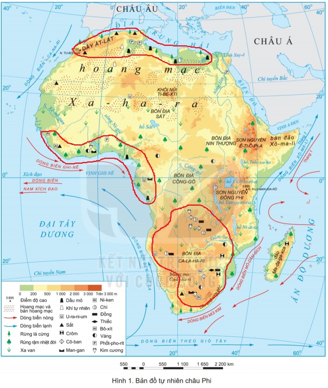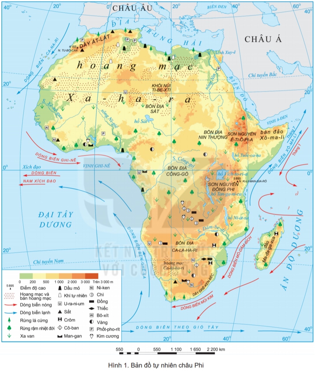 – Quan sát hình 1 (Đọc bảng chú giải để biết được kí hiệu và tên các loại khoáng sản chính ở châu Phi, sau đó xác định trên bản đồ vị trí phân bố các loại khoáng sản đó).