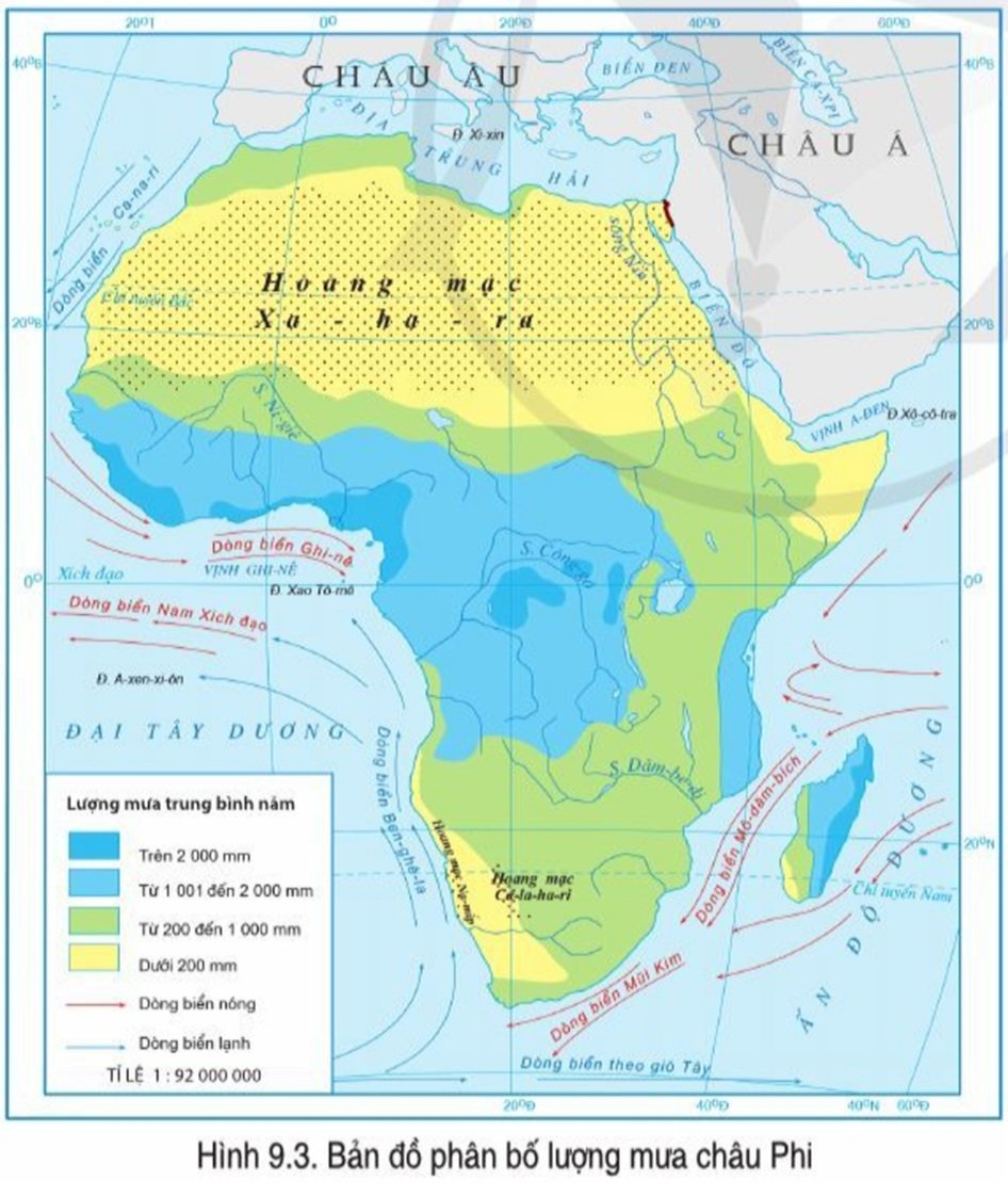 – Dòng biển lạnh Ca-na-ri chảy ven bờ Tây Bắc của châu Phi, dòng biển lạnh Ben-ghê-lachảy ven bờ Tây Nam châu Phi, lượng mưa vùng ven biển này thường dưới 200 mm.