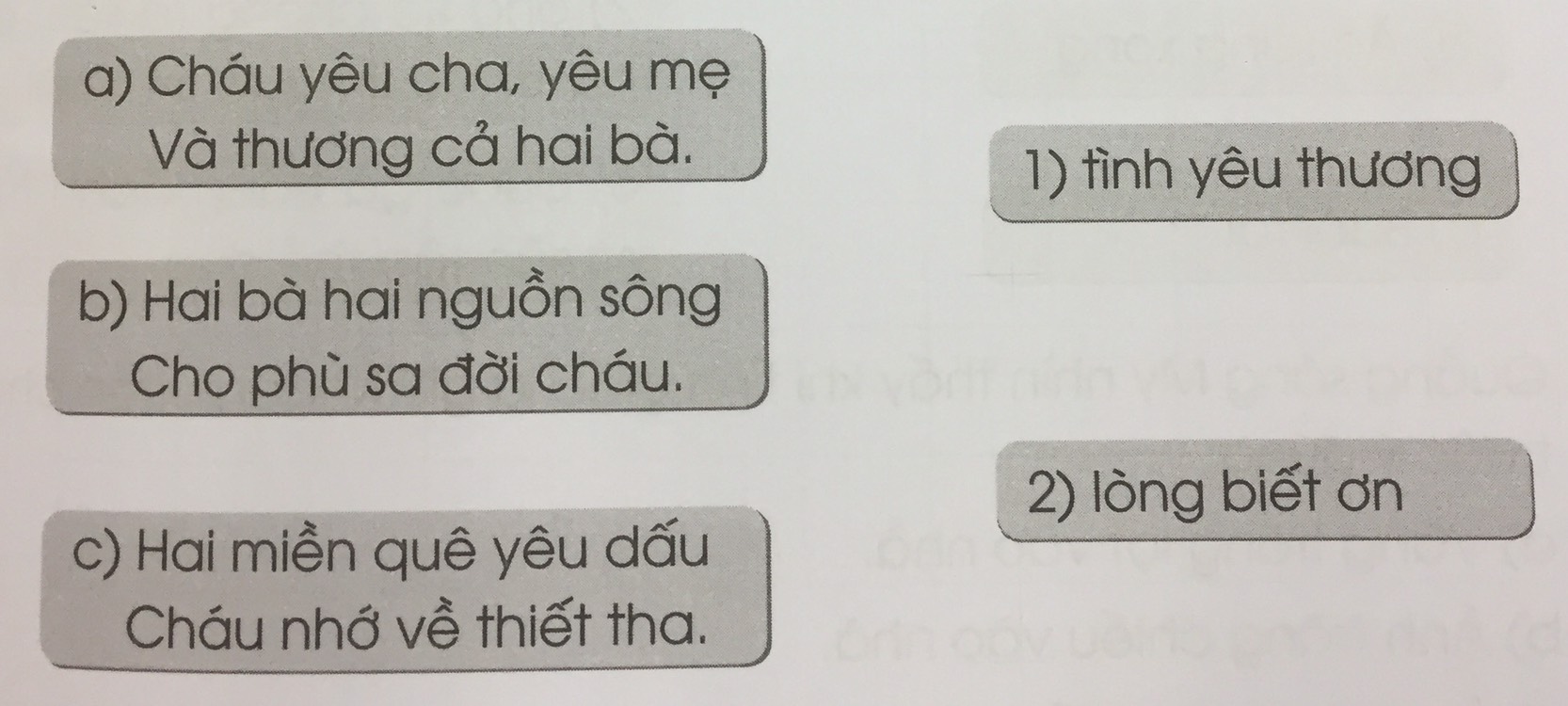 Mỗi câu thơ dưới đây nói lên tình cảm gì của cháu đối với hai bà? Nối đúng: