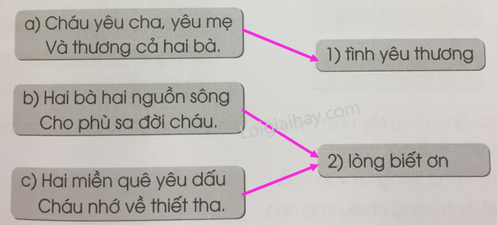 Mỗi câu thơ dưới đây nói lên tình cảm gì của cháu đối với hai bà? Nối đúng: