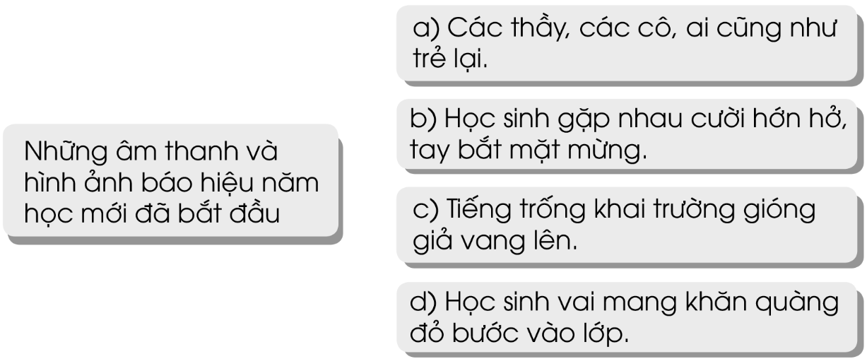 Những âm thành và hình ảnh nào báo hiệu năm học mới đã bắt đầu? Nối đúng: