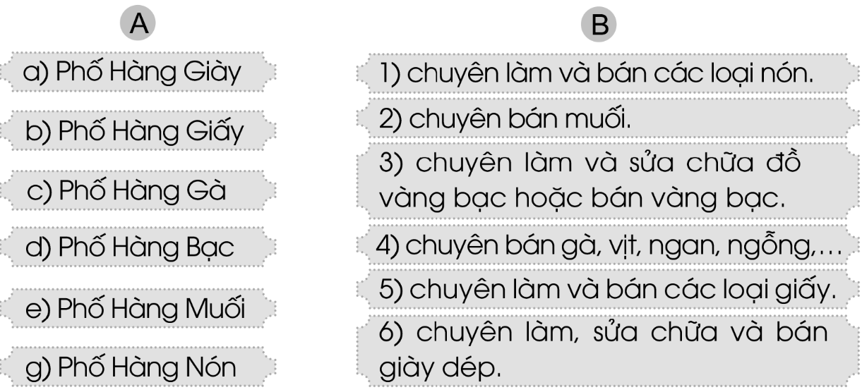 Đọc các tên phố sau đây, em hiểu ngày xưa phố đó chuyên làm hoặc bán mặt hàng gì? Nối đúng: