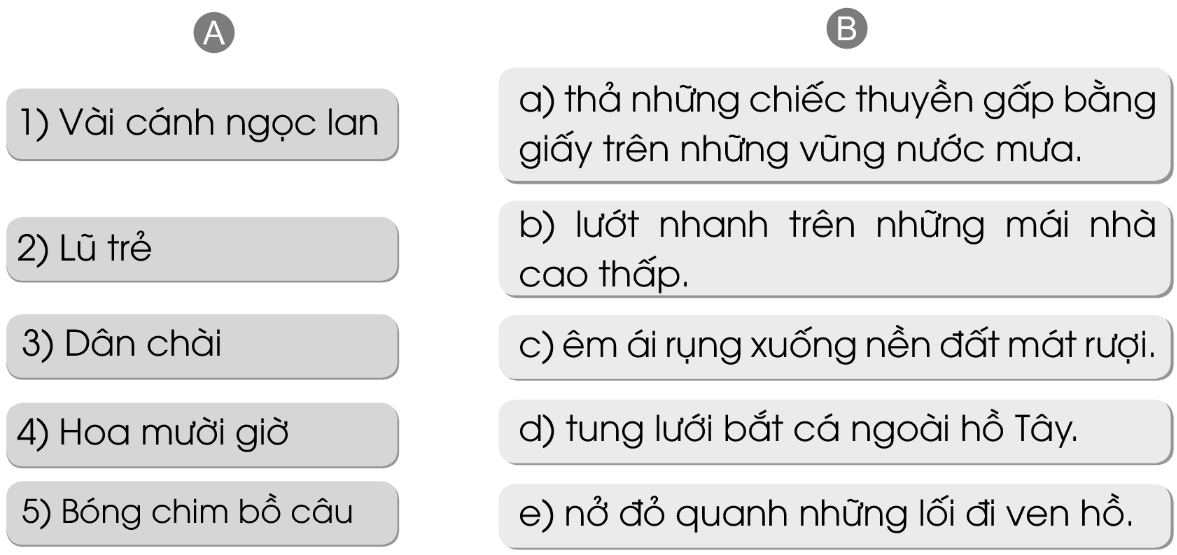 Tìm những hình ảnh thanh bình bên ngoài phòng thi trong lúc Thủy chơi đàn. Nối đúng: