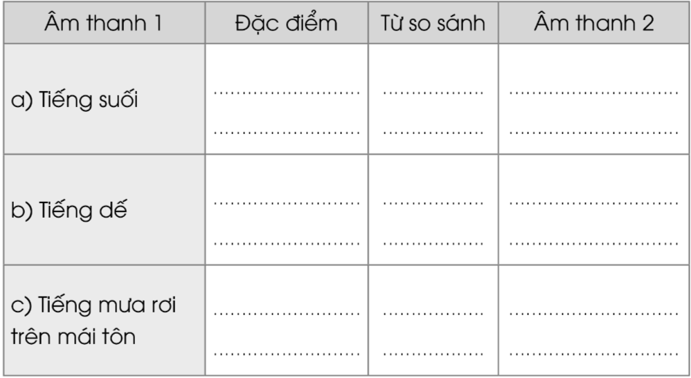Những âm thanh nào được so sánh với nhau trong các câu thơ, câu văn sau? Viết từ ngữ phù hợp vào ô trong bảng sau: