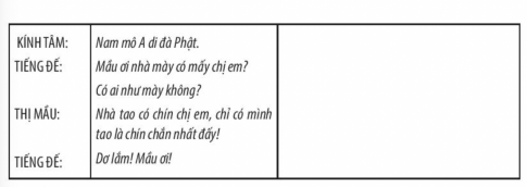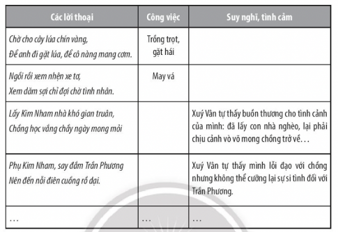 Qua lời thoại (nói và hát), nhân vật Xúy Vân cho thấy có sự mâu thuẫn giữa mơ ước và thực tại trong đời sống hôn nhân của bản thân cô. Ví dụ: mơ ước “Để anh đi gặt để nàng mang cơm” mâu thuẫn với thực tại “Chẳng nên gia thất thù về, /Ở làm chi nữa …”. Liệt kê thêm ít nhất hai biểu hiện tương tự về mâu thuẫn như vậy trong văn bản theo mẫu bảng dưới đây (làm vào vở).
