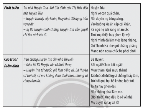 2. Qua các lời thoại, văn bản cho thấy xung đột giữa hai nhân vật Huyện Trìa và Bà Huyện, vợ ông có quá trình nảy sinh, phát triển, lên đến cao trào (điểm đỉnh). Hãy tóm tắt quá trình ấy và làm rõ tác động qua lại giữa các nhân tố/ hành động và biểu hiện độ căng của xung đột theo mẫu bảng sau (làm vào vở)